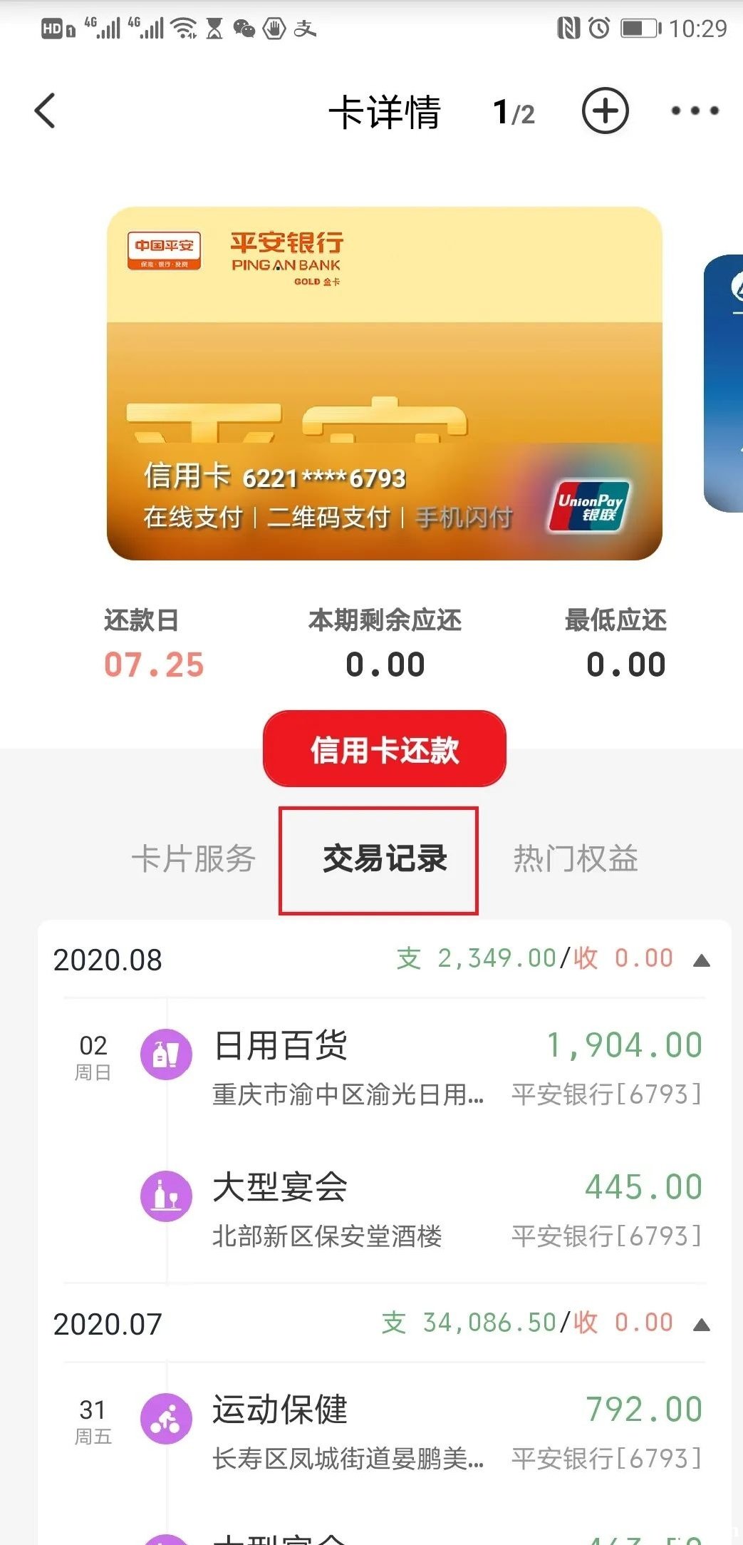 3、選擇綁定的信用卡,點(diǎn)擊【交易記錄】,可向上滑動(dòng),查看詳細(xì)的交易記錄;