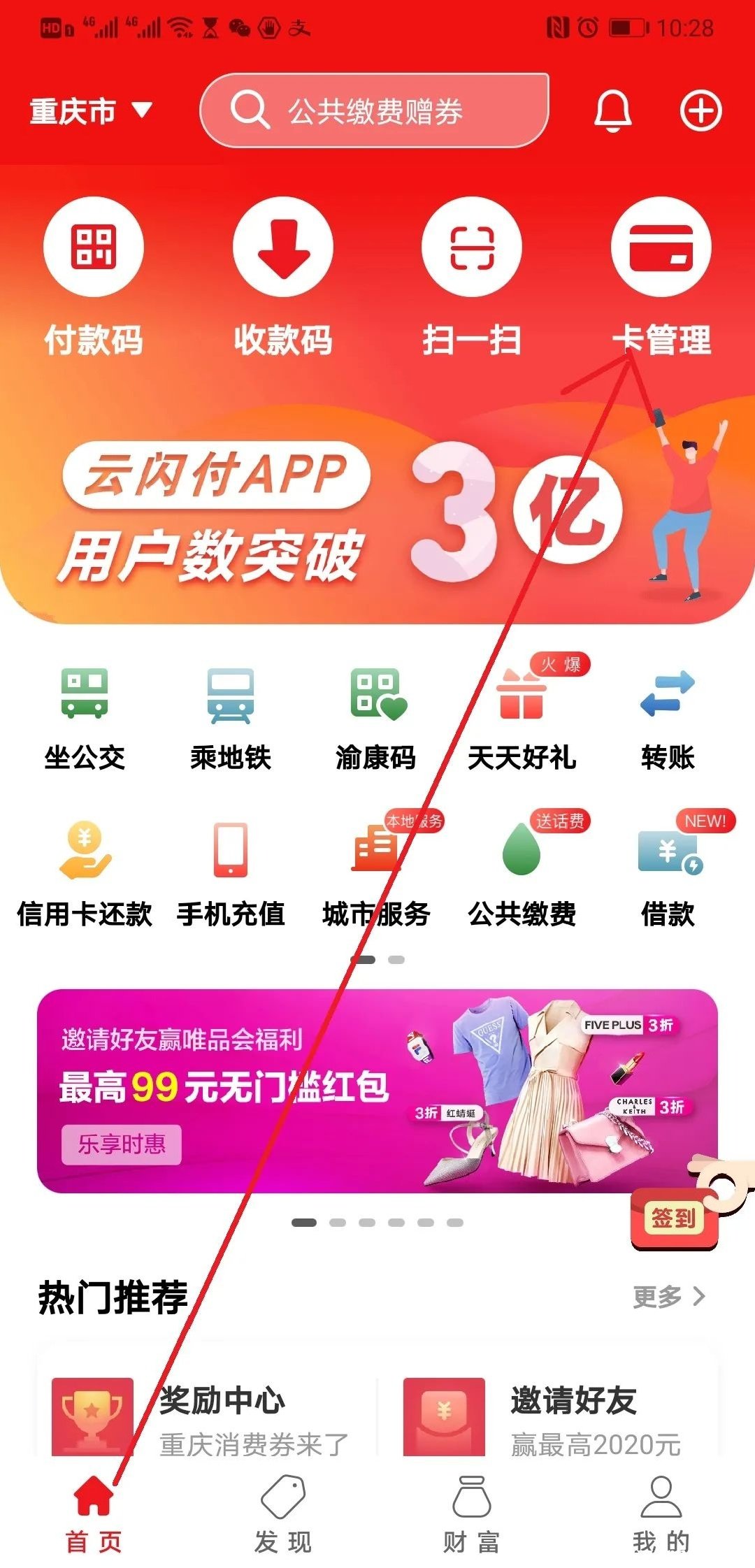 2、然后,注冊(cè)登錄云閃付APP,實(shí)名,并點(diǎn)擊首頁(yè)右上角的【卡管理】綁定信用卡;