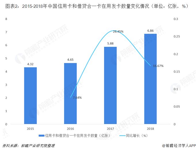 信用卡發卡數量逐年增長,增速高于銀行卡在用發卡數量,2018年信用卡和借貸合一卡在用發卡數量為6.86億張,同比增長16.73%。