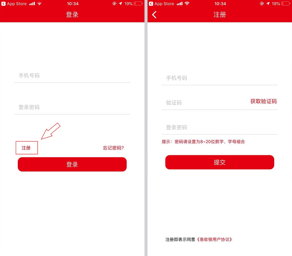 打開易收銀APP點(diǎn)擊注冊(cè) 進(jìn)入注冊(cè)界面 進(jìn)行注冊(cè)