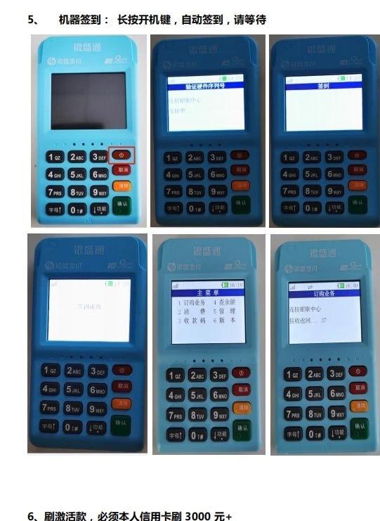 6機(jī)器激活操作流程:機(jī)器按紅色按鍵開機(jī)會(huì)自動(dòng)更新參數(shù)后,簽到01 密碼0000 →主頁面選1訂購業(yè)務(wù)→輸入金額(商戶首次用本人信用卡刷卡≥3000元視為激活)→輸入密碼,刷卡(每一張卡首次交易都需要插卡/刷卡后才可以進(jìn)行閃付)