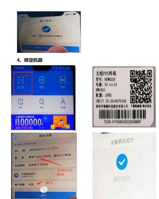 2.3機(jī)器綁定:打開APP,首頁的掃一掃→掃描機(jī)器背面條形SN→按提示步驟做身份檢測(cè)(人臉識(shí)別)→同意代收服務(wù)費(fèi)點(diǎn)擊確定→成功綁定設(shè)備之后就可以首刷激活