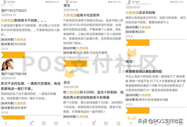 2020年4月8日,某網(wǎng)友反映其使用的“九色優(yōu)選”代還APP不到賬,據(jù)了解官方說的是十秒鐘到賬,但幾個(gè)小時(shí)過去了仍未到賬;隨后小編查詢各大投訴平臺(tái)發(fā)現(xiàn),近日“九色優(yōu)選”頻繁性遭用戶投訴不到賬。