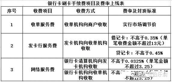 上圖顯示的就是說國家發(fā)改委明文規(guī)定的關(guān)于pos機費率的分成形式,分別是發(fā)卡銀行、結(jié)算機構(gòu)和三方支付平臺。發(fā)卡銀行就是說發(fā)給你借記卡(借記卡)或者信用卡(借記卡)的銀行,結(jié)算機構(gòu)(中國銀聯(lián)和網(wǎng)聯(lián)平臺),三方支付平臺(第三方支付公司等)。信用卡手續(xù)費就是說由這三家分了,表里顯示的都比較清楚了。