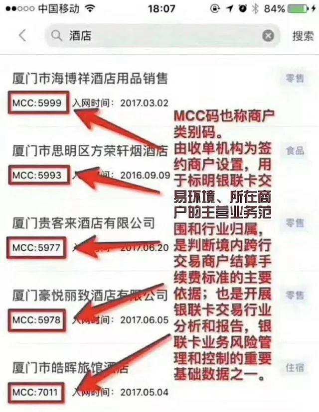 商戶類型碼(通稱MCC,MCC碼)四位大數(shù)字編碼構(gòu)成。由三方支付平臺為簽訂商戶設(shè)定,用以標(biāo)出銀聯(lián)信用卡交易自然環(huán)境、所屬商戶的主營范疇和制造行業(yè)所屬,是分辨地區(qū)轉(zhuǎn)賬交易商戶清算服務(wù)費(fèi)規(guī)范的關(guān)鍵根據(jù);都是進(jìn)行銀聯(lián)信用卡交易行業(yè)現(xiàn)狀和匯報,銀聯(lián)信用卡業(yè)務(wù)流程風(fēng)險管控和操縱的關(guān)鍵數(shù)據(jù)資料之一。