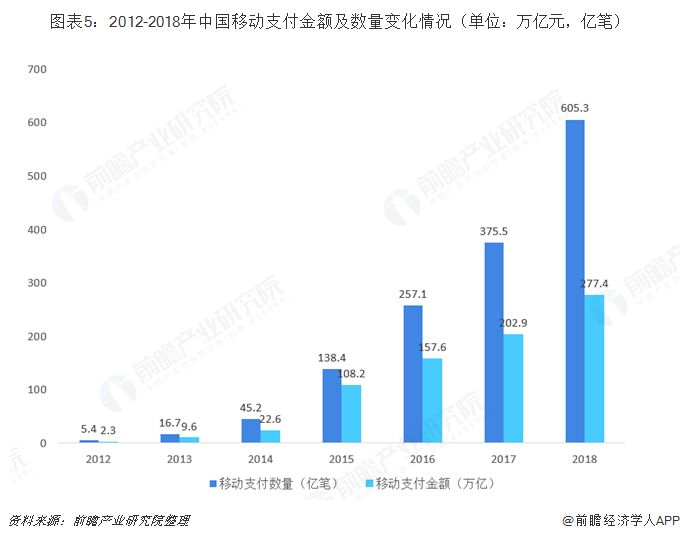 據(jù)中國(guó)支付清算協(xié)會(huì)最新數(shù)據(jù)顯示,2017年,中國(guó)移動(dòng)支付規(guī)模達(dá)202.93萬億元,全球排名第一,近五年移動(dòng)支付規(guī)模年復(fù)合增速高達(dá)117.6%;2018年,中國(guó)移動(dòng)支付業(yè)務(wù)605.3億筆,金額277.4萬億元,同比分別增長(zhǎng)61.2%和36.7%。